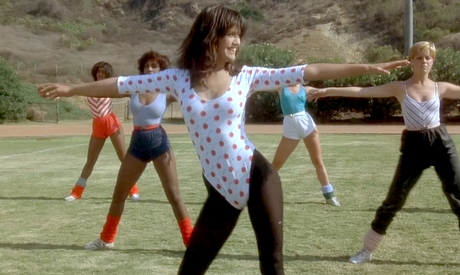 her dorm room, doing some aerobics exercises outdoors and